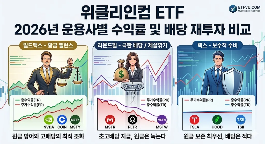 특히 시장을 선도하는 일드맥스, 렉스, 라운드힐 3대 운용사의 수익률 경쟁이 그 어느 때보다 치열한 상황입니다. 오늘은 2026년 데이터를 기준으로 기초자산의 주가 수익률과 배당 수익률을 철저히 분리하여, 어떤 운용사의 방어력과 배당 지급 능력이 가장 뛰어났는지 낱낱이 파헤쳐 보겠습니다.