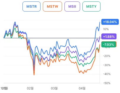 총수익률 배당 재투자 기준에서는 일드맥스 MSTY가 17.17%센트로 1위를 차지했으며, 라운드힐 MSTW가 15.23% 2위, 렉스 MSII가 13.58%로 3위를 기록했습니다.
