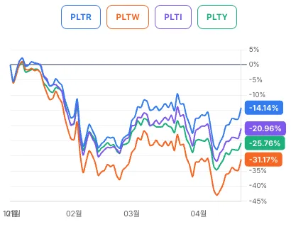 총수익률에서는 일드맥스 PLTY가 마이너스 10.97%로 가장 선방하며 1위를 차지했습니다. 렉스 PLTI는 마이너스 15.50%로 2위, 라운드힐 PLTW는 마이너스 19.33%로 최하위를 기록했습니다.