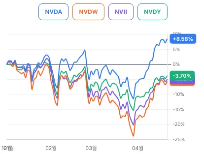 의견 : NVDA을 추종하는 경우 모든 종목이 비슷한 수준으로 움직임을 보여줍니다.