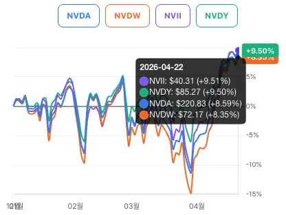 주가 수익률은 일드맥스 NVDY가 마이너스 3.70%로 하락을 최소화하며 1위, 렉스 NVII가 마이너스 4.29%로 2위, 라운드힐 NVDW는 차트상 가장 깊은 골을 파며 최하위에 머물렀습니다.
