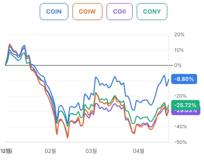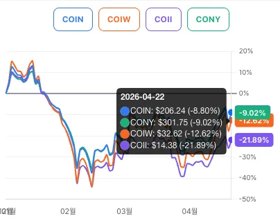 의견 : COIN을 추종하는 경우 CONY, COIW 정도 주가를 따라간다 봐야겠네요.