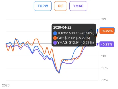 주가 수익률 관점에서는 라운드힐 TOPW가 5.50% 수준으로 1위, 렉스 GIF가 5.22%의 수익으로 근소하게 2위, 일드맥스 YMAG가 -0.23%로 3위를 기록하는 차별화된 양상이 나타났습니다.