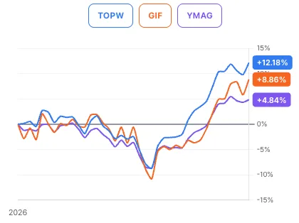 총수익률 측면에서 라운드힐 TOPW가 12.18%로 1위, 렉스 GIF가 8.86%로 2위, 일드맥스 YMAG가 4.80%로 3위 기록했습니다.